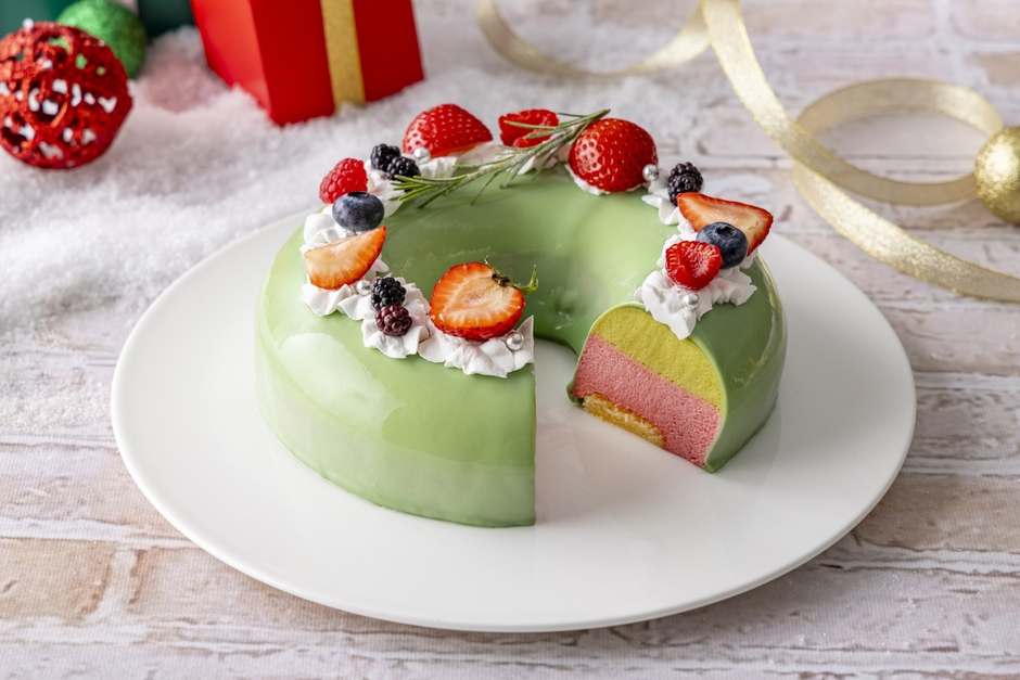 コク深いピスタチオ、甘酸っぱいラズベリーと苺の2層を楽しめるムースケーキは、クリスマスリースがモチーフ。トップには生クリームと4種のフレッシュベリーを飾りました。