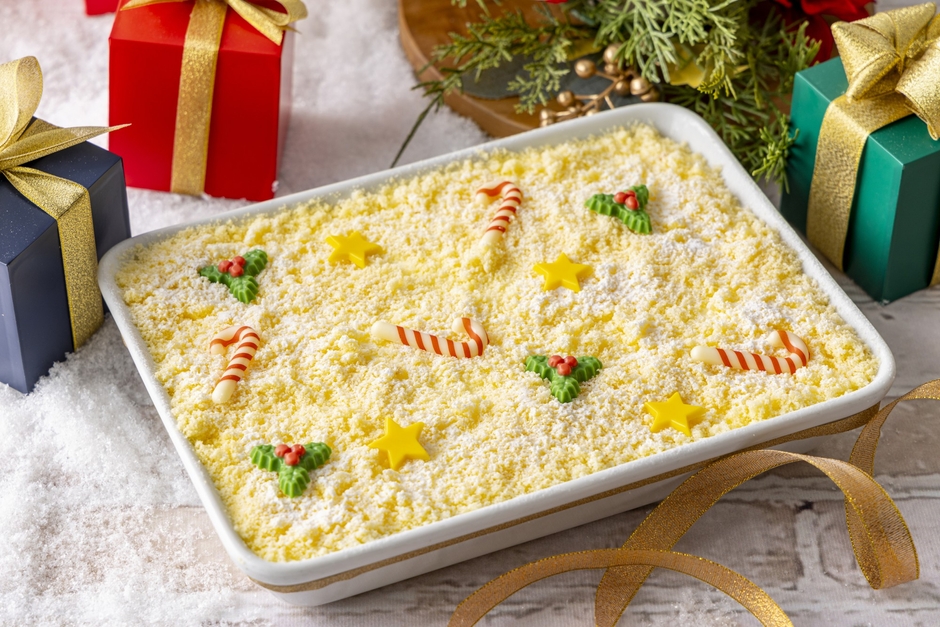 スポンジを敷いたレアチーズケーキに、生クリームとスポンジクラムを重ね、星、ヒイラギ、キャンディケインのチョコレートを飾りました。思わずたくさん手に取りたくなるようなワクワク感を楽しめるスコップケーキです。