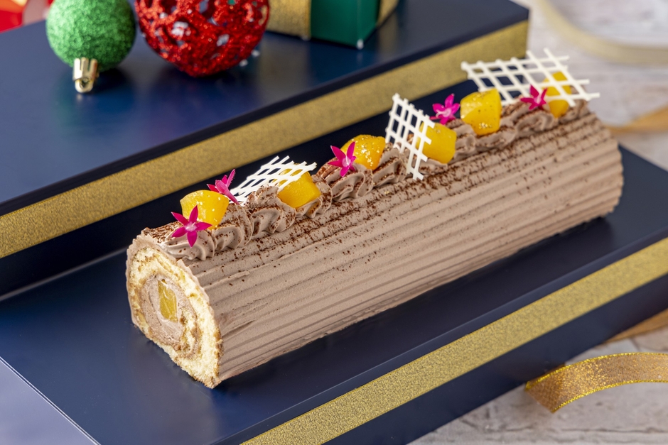 クリスマスの定番ブッシュ・ド・ノエル。アールグレイティークリームを使用し、紅茶文化のある英国にぴったりなクリスマスケーキにしました。ロールの中には黄桃を忍ばせ、果実感も加えています。