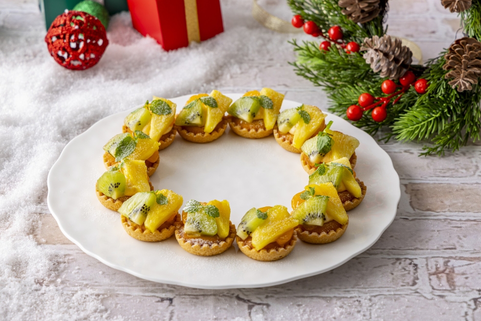 アーモンドクリーム入りタルトにカスタードを絞り、みかん、パイナップル、キウイ、ミントを飾った贅沢なミニタルトは、お皿に並べるとまるでクリスマスリースのよう。フルーツたっぷりのタルトをぜひご堪能ください。
