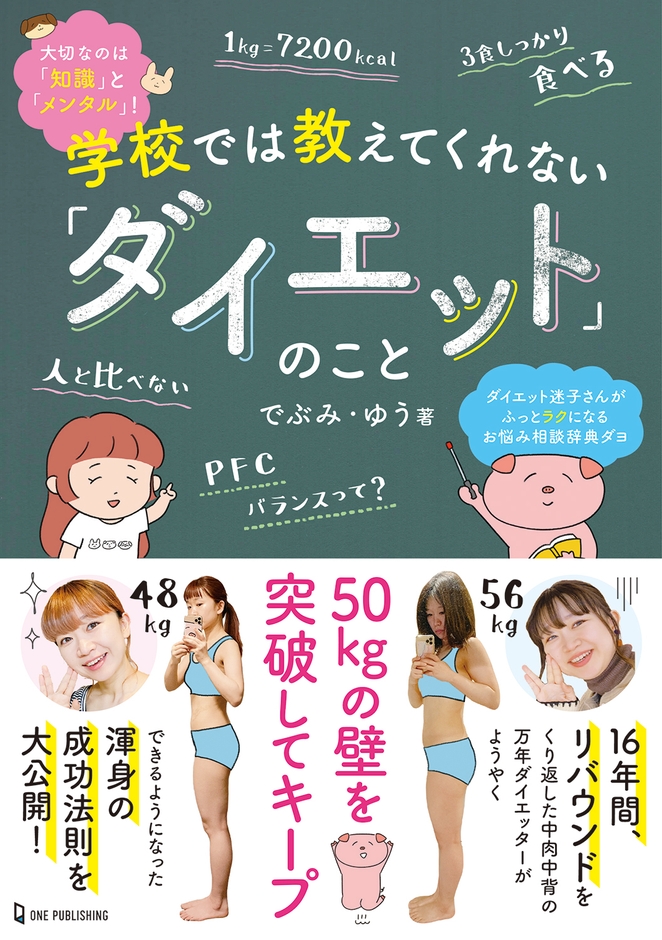 ダイエットインスタグラマーのでぶみ・ゆうさんは2年前に人生最後のダイエットを決意して、体脂肪が増えるしくみや基礎代謝のこと、PFCバランスなどダイエットの基礎知識を学びます。「ダイエット=食べない」から「ダイエット=バランスよく食べる」ことを知ってから、それまでなかなか超えられなかった50kgの壁を超え、キープできるように。「これを学校で教えてほしかった」という正しい知識をダイエッターのお悩み別に掲載。自分と同じように遠回りしてほしくない、ダイエット迷子になったら開いてほしい、と気持ちを込めてまとめた一冊です。