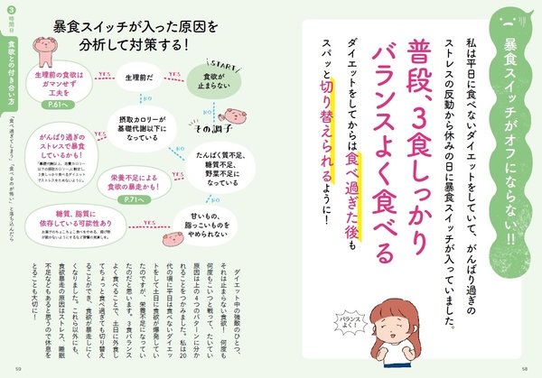 本書の構成は、学校で教えてほしかった、ということから1時間目、2時間目と授業形式にまとめています。そのなかでお題として出てくる、たくさんのダイエットのお悩みは、すべてでぶみ・ゆうさんのインスタグラムのフォロワーさんたちがリアルに投げかけてきたものばかり。「ダイエットをがんばれない自分が嫌いです」「甘いもの欲が止まらない!」「ダイエット中は白米やパンを食べちゃダメ?」など誰もがダイエット中に思い悩んだことのある内容に、でぶみ・ゆうさんが自身の失敗と成功体験を織り交ぜて、真剣に答えてくれています。
