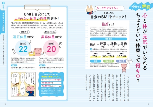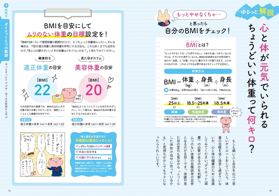 でぶみ・ゆうさんのインスタグラムでは、ぶたさんをはじめ、かわいいキャラクターたちが、ダイエットの基礎知識を楽しく、わかりやすく伝えているのが人気です。本書では、そのキャラクターたちが勢ぞろいして、正しいダイエット情報を、誰にでもわかりやすいようにまとめています。適正体重や体重・体脂肪が増えるしくみ、PFCバランスや、糖質の働きなど。これらを知ることで、3食、主食を食べてもやせられることがわかり、無理なダイエットをする人が減ってほしいとの願いも込めています。