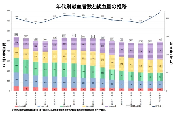 出典:厚生労働省 年代別献血者数と献血量の推移