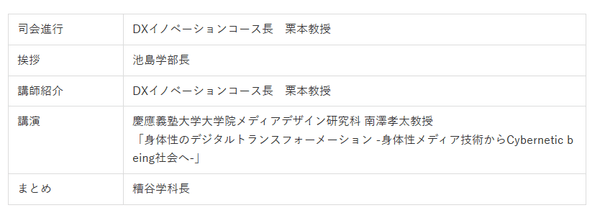 2025年5月21日(水)14:40〜16:10、DX-Labの開設を記念し、慶應義塾大学大学院メディアデザイン研究科の南澤孝太教授による特別講演会を開催。講演テーマは「身体性のデジタルトランスフォーメーション -身体性メディア技術からCybernetic being社会へ-」。最先端の研究成果とその社会実装に向けた取り組みについてお話しいただきます。※オンデマンド視聴の案内は別途、下段の関連リンクからご案内させていただきます。