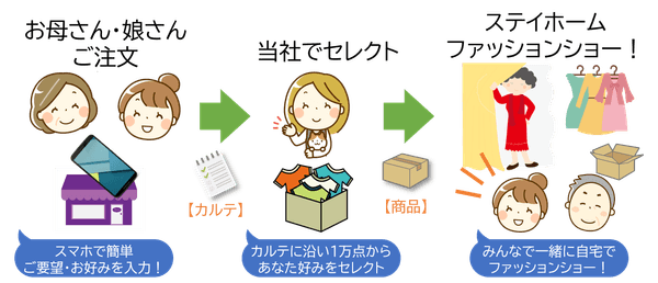 本サービスは、シニア女性のご要望をカルテに記入いただくことで、お客様に合った最大10点の衣料品を、プロの眼でセレクトし自宅へ発送。お客様は選んでもらったアイテムを、自宅にいながら、まるで店舗でフィッティングしているかのように楽しめる新サービスです。コロナ禍を避けて、家族や友人と一緒にフィッティング(ファッションショー)を楽しんで頂けます。