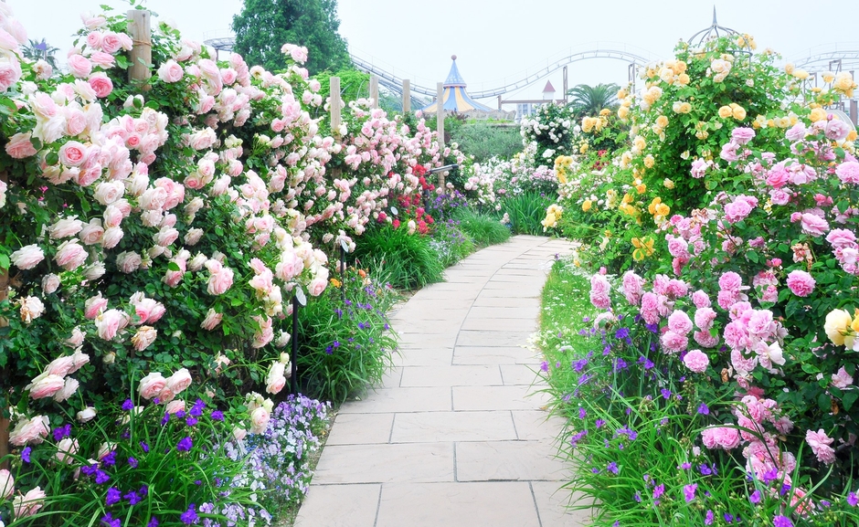 1955年(昭和30年)に「大バラ園」として誕生して以来、ひらかたパークを彩ってきたローズガーデン。春しか見られない原種のバラや、つるバラ、花色・花形が豊富な四季咲き性のバラなど、約600種4,000株の多種多様なバラが咲き誇ります。※開花状況は品種・気候により異なります。