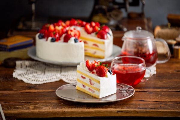 なめらかなディプロマットクリームと甘酸っぱいいちごのクリームを重ねたケーキにいちごやマカロンで華やかに仕上げました。