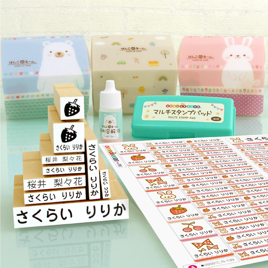 ■セット内容:防水お名前シール、お名前スタンプ8本、ぷちスタンプ1本、マルチスタンプパッド、インク溶解液、収納ケース(デコシールつき)