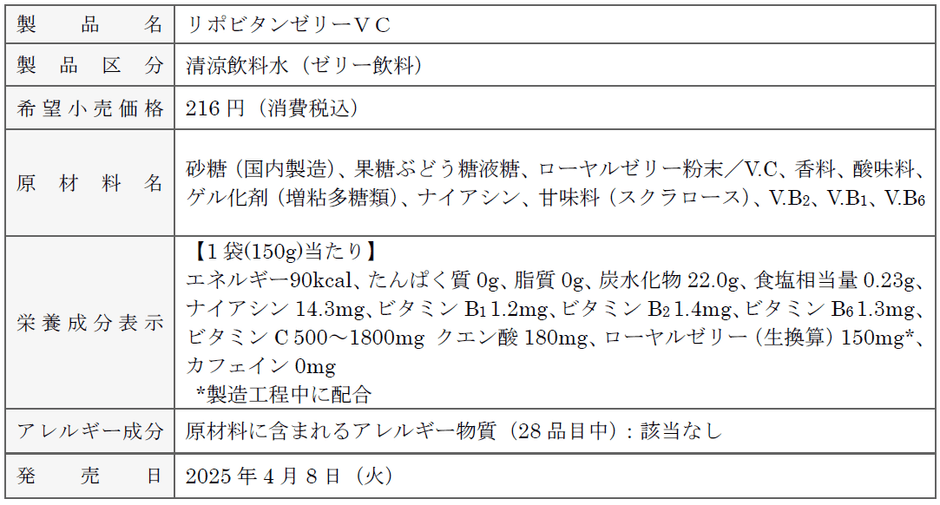 大正製薬株式会社[本社:東京都豊島区 社長:上原 茂](以下、当社)は、多忙な現代人の健康をサポートする新しい栄養摂取ゼリー飲料「リポビタンゼリーVC」(清涼飲料水)を2025年4月8日(火)より全国発売いたします。