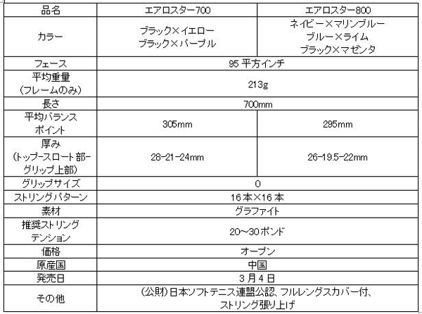 住友ゴムグループの(株)ダンロップスポーツマーケティング(社長:木越 浩文)は、ソフトテニスの初級者・入門者用ラケットのダンロップ「エアロスター」シリーズ2機種(「エアロスター700」2色、「エアロスター800」3色)を3月4日から販売します。価格は全てオープン価格です。