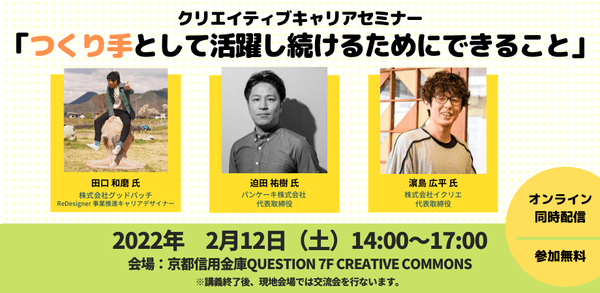株式会社ツクリエ(本社:東京都千代田区、代表取締役:鈴木英樹)は、京都市より運営受託したクリエイティブキャリアセミナー「つくり手として活躍し続けるためにできること」を2月12日(土)に開催します。