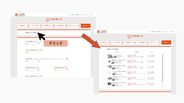 提案書作成作業ページの「表示情報選択」ページで選択した類似物件を「価格情報入力」ページでも確認ができる機能です。提案価格を入力する際に、選択した類似物件を同ページ内で参照しながら価格設定したいというニーズにお応えしました。