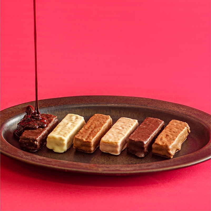フルーツやコーヒーの味わいとサクサクパイの食感を楽しむミルフィーユを、口溶けの良いなめらかなチョコレートでコーティングしました。