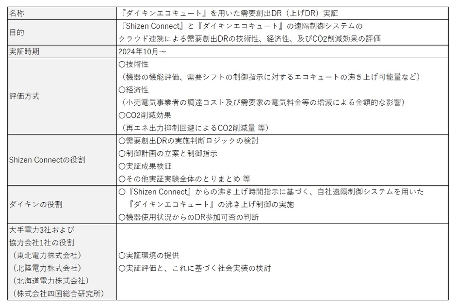 VPP(*1)プラットフォーム開発会社の株式会社Shizen Connect(以下、Shizen Connect)と空調総合メーカーのダイキン工業株式会社(以下、ダイキン)は、再生可能エネルギー(以下、再エネ)の有効活用を目的に電力需要を創出するディマンド・リスポンス(以下、需要創出DR)(*2)において、家庭用ヒートポンプ給湯機エコキュートの沸き上げ時間を、再エネの発電量が多い時間帯にシフトする有効性を検証する実証実験(以下、本実証)に共同で取り組みます。本実証は、東北電力株式会社、北陸電力株式会社、北海道電力株式会社、四国電力グループの株式会社四国総合研究所とともに、2024年10月より開始します。