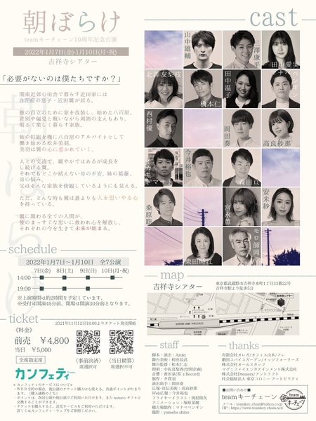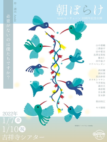 teamキーチェーン(代表:Azuki)主催によるteamキーチェーン10周年記念公演『朝ぼらけ』が2022年1月7日 (金) ~2022年1月10日 (月・祝)に吉祥寺シアター(東京都武蔵野市)にて上演されます。チケットはカンフェティ(運営:ロングランプランニング株式会社、東京都新宿区、代表取締役:榑松 大剛)にて発売中です。