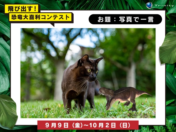 飛び出す恐竜を使った、大喜利コンテストをTwitterにて開催します。景品は総額50,000円分のトリニティポイント(以下:トリポ)。トリポは1ポイント1円分でお買い物をお楽しみいただける、トリニティオンラインストアの専用ポイントです。お題は「写真で一言」。たくさんのご応募をお待ちしております。