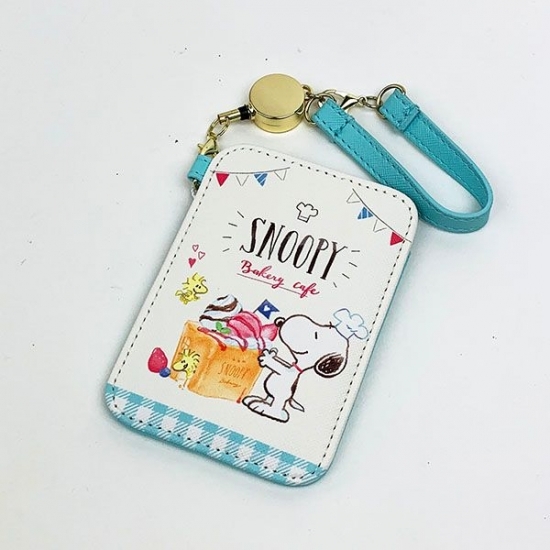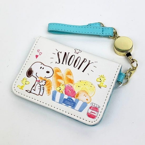 お次はリールストラップつきのパスケースです。こちらもベーカリーがたくさんデザインされていて、中にはスヌーピーのパンも?サイズは10×7.5×1cmの定番サイズです。