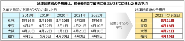 こうした考え方で各地の予想日を見ていくと、今年の試運転前線は、4月上旬に那覇に上陸し、4月中旬には福岡へ、その後半月程度かけて本州を北上し、5月後半には札幌に到達しそうです。