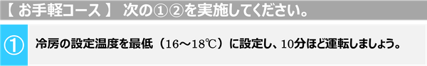 また、エアコンは室温が設定温度に到達すると室内を冷やす動作を停止するため、最低温度に設定しておくことで、室温が設定温度に早期に到達することを防ぎます。なお、最低温度は機種によって異なります。