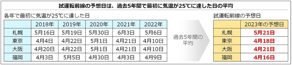 本前線に記載の予想日は、全国の各地域の過去5年間において、各年の最高気温が25℃に達した最初の日を調査し、それらを平均した日としています。