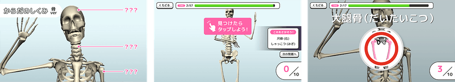 ダンスするガイコツが登場?!出題される骨と同じ箇所をタップしてからだの仕組みを楽しく学べます!