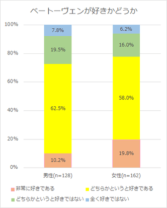 ベートーヴェンについて好きである(「非常に好きである」「ある程度好きである」)と回答した人は全体の75%となり、特に「非常に好きである」と回答した割合を男女別で見ると男性10.2%、女性19.8%となっており、男性の倍近くの女性がベートーヴェンを非常に好きだと思っていることが分かりました。