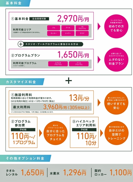 お客様のその日の気分、都合により、今日はジムだけ、今日はプールでゆっくり泳ぐ等、業界初の自由に選べるスポーツジムです。