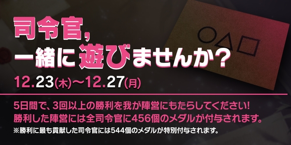 イベント期間中、合計5日間のうち、3回以上、占領戦にて勝利をした陣営の司令官全員に456個のメダルが支給されます。