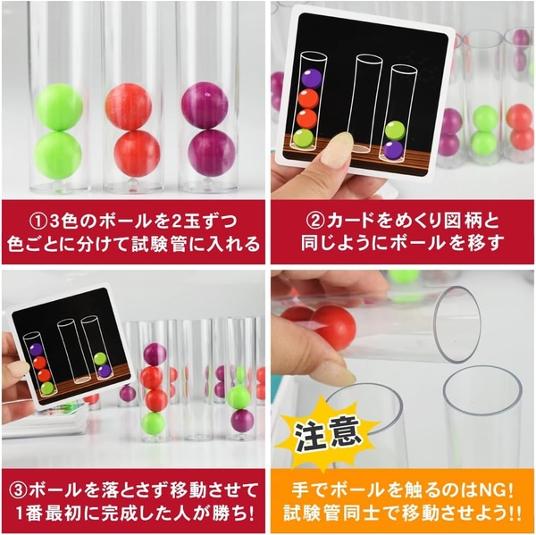 このゲームは、3色のボールを使って試験管内で色を揃えるパズルゲームです。カードに描かれた図柄通りにボールを移動させて、最も早く完成させた人が勝ちです。ボールを手で触れずに試験管を使って移動させるだけの簡単なルールなので、初心者の方でも盛り上がれるところが嬉しいポイント♪「いかに早く」そして「効率よく移動できるか」を考えるのがゲーム攻略のカギとなります!