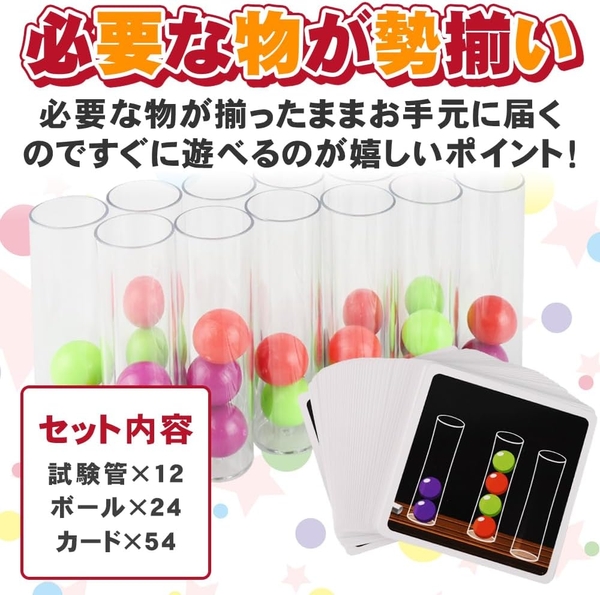 試験管以外にボールやカードの全アイテムが揃っており、お手元に届きましたらすぐにゲームをプレイできます。簡単なルールだからこそお子様から大人まで幅広い年齢層で夢中になって楽しめること間違いなし!誕生日会・ハロウィン・クリスマス・年末年始など人が集まるシーンにあると盛り上がるゲームです。