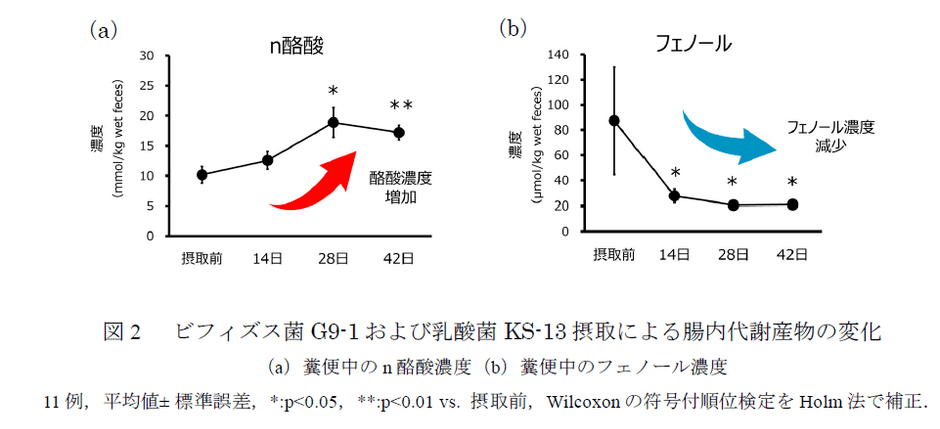 【研究成果2:ビフィズス菌G9-1および乳酸菌 KS-13は腸内のn酪酸を増加、フェノールを減少させ、便臭を軽減する】