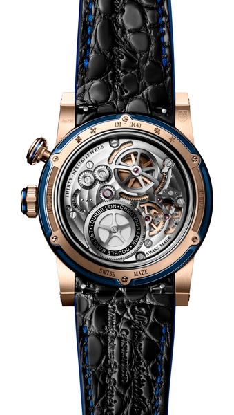 クロノグラフとトゥールビヨンの美しい動きを鑑賞しやすくするために、風防のクリスタルサファイアガラスをドーム型に成型しています。18Kローズゴールドのケースと、鮮やかなブルーのインナーベゼル・アリゲーターレザーストラップが、高貴な印象を与えながらも、レッドのクロノグラフ針がアクセントとなりメリハリを効かせています。ラグは中央部をくり抜き軽量化、ストラップは滑らかに湾曲しケースに沿うようにデザイン。