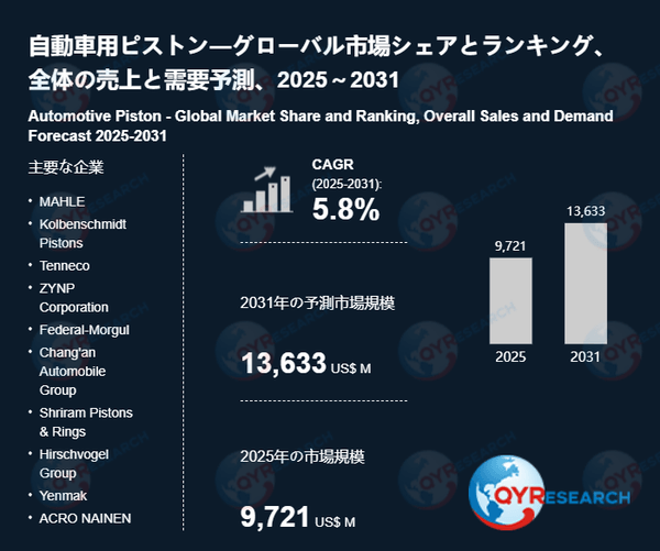 QYResearchが発表した新たな市場調査レポート「自動車用ピストン―グローバル市場シェアとランキング、全体の売上と需要予測、2026~2032」によると、世界の自動車用ピストン市場規模は2024年の約9254百万米ドルから2025年の9721百万米ドルへと順調に拡大すると見込まれ、予測期間中は年平均成長率(CAGR)5.8%で成長し、2031年には13633百万米ドルに達すると予測されている。