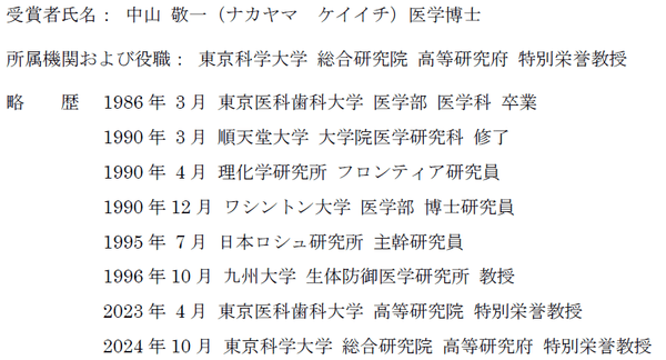 ○中山 敬一氏 東京科学大学 総合研究院 高等研究府 特別栄誉教授