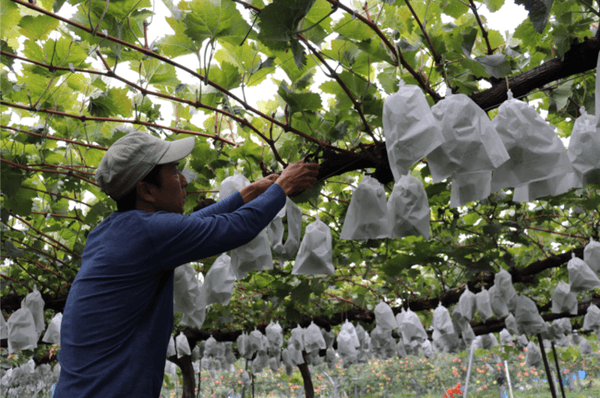 粒が大きく、種のないシャインマスカットは、栽培に適した土壌や気候はもとより、農園の愛情のこもった丁寧な栽培法がもっとも重要です。上質なシャインマスカットは、芽が出てきたら、よい芽のみを選定して芽かきしたり、きちんと光合成ができるように不要な根や葉を切り、育った実には一房づつ丁寧に傘と袋をかけていきます。収穫のある6月、7月にはこうした丁寧な手入れ、入念なチェックが休みなく行われます。