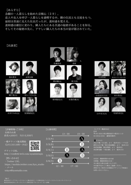 kys STUDIO TOKYO(代表:浅野寛介)主催、『アヤしい隣人』が2023年3月2日 (木) ~2023年3月6日 (月)にシアター風姿花伝(東京都新宿区中落合2-1-10)にて上演されます。