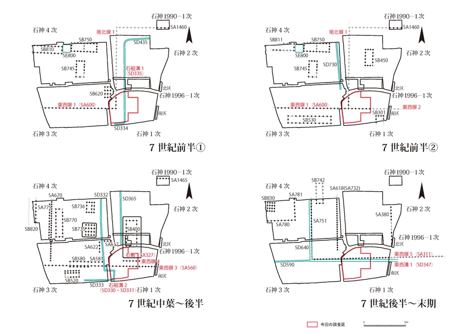 東西塀1の東西長は西の第3・10 次調査区内で検出した一連の遺構(SA600・SA1600)を含めて約102m となり、さらに西へ続く。南北塀1は石神1990-1 次で検出した東西塀(SA1460)に接続すると推定され、南北長は約58m と考えられる。北の第21 次調査(飛鳥藤原第156 次)では、7世紀前半の東限区画塀と推定される遺構(SA4327)を検出しており、南北塀1の北延長線上はこの東限付近に至るため、さらに北進する可能性もある。