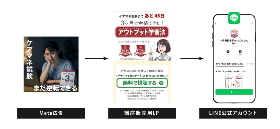 広告 → LP → LINE友だち登録 → ステップ配信(全16通) → 講座購入