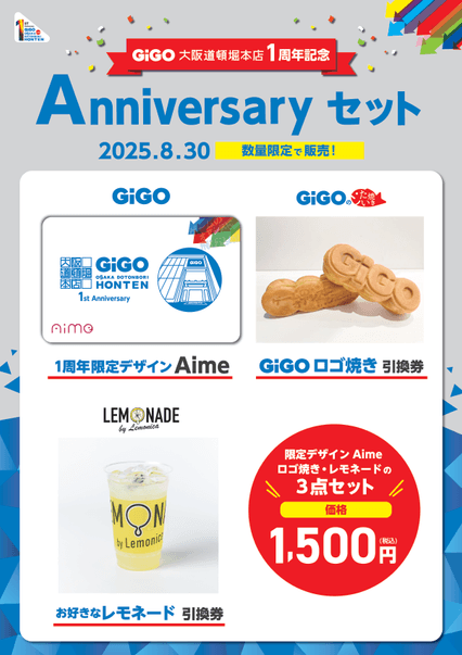 大阪道頓堀本店の1周年を記念し、オリジナルデザインのアミューズメントICカード「Aime 」や、「GiGOロゴ焼き」および「レモネード」の3点をセットにして販売いたします。
