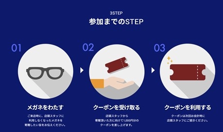 ご来店時、スタッフにご不要になられたメガネを寄贈したい旨をお伝えください。寄贈いただいた方にパリミキで利用できる1,000円分のクーポンを差し上げます。次回ご購入の際にご提示ください。クーポン券はなくなり次第終了、利用期限は2022年3月31日までとなります。
