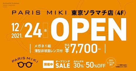 「パリミキ」「メガネの三城」「オプティックパリミキ」を展開している株式会社 三城(本社:東京都港区、代表取締役社長:澤田将広、以下「パリミキ」)は、東京都、東京スカイツリータウン ソラマチ4階にパリミキ 東京ソラマチ店を12月24日(金曜日)にオープンいたします。