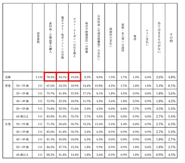 ・ポイントの活用方法として最も多いのは「食料品・日用品等の購入(78.5%)」と予想通りの結果。
