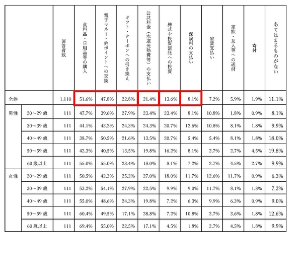 ・また、「株式や投資信託への投資」も13.6%が使ってみたいとしており、「現在の使い道で割合が多いもの」の8.2%からしてみると、一定の伸びしろが確認できる。このほか、「保険料の支払い」を使ってみたいとした割合は8.1%で、現行の1.9%と比較すると伸びしろが大きいことが窺えた。投資や保険など金融サービスとポイント利用には少なからず親和性があることが推察される。