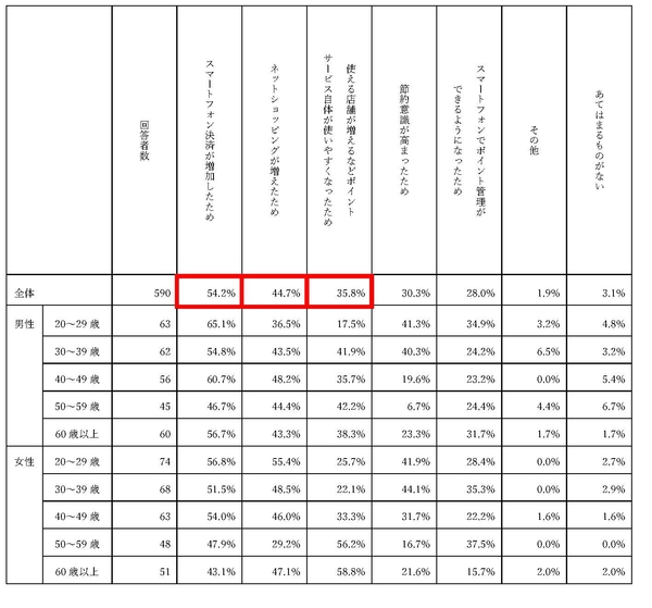 ・なお、第3位は「使える店舗が増えるなどポイントサービス自体が使いやすくなったため」の35.8%で、第4位「節約意識が高まったため」の30.3%をおさえる結果。本調査においては、節約意識以上に利用のしやすさや汎用性が重視されている事実が浮かび上がっている。