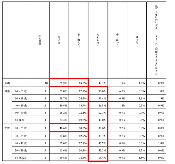 ・ポイントサービスの利用が「増えた(27.3%)」「少し増えた(25.0%)」「過去3年以内にポイントサービスを利用するようになった(0.9%)」の合計が53.2%と過半になっている一方、「少し減った(1.8%)」「減った(1.0%)」の合計がわずか2.8%にとどまっていることから、過去3年程度で顕著に普及していることが窺える。特に、本調査では、20代女性の「増えた」が48.6%、「少し増えた」が18.0%となっており、若い女性層の意識の変化が表れていた。
