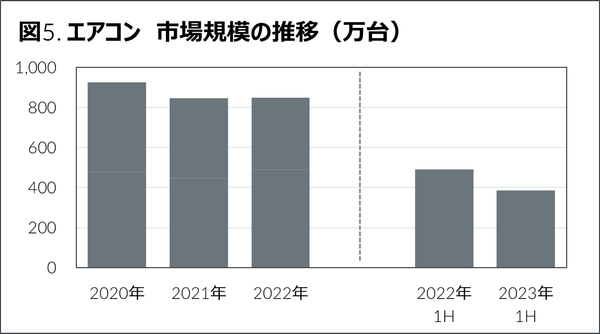 エアコンは前年から22%減の380万台となった(図5)。前年は高気温の影響で、上半期の販売が好調に推移した。23年の上半期はそれほど気温が上昇せず、販売は不調だった。冷房能力別でも傾向に変化はなく、いずれの能力帯も前年から二けた減となった。冷房能力別の数量構成比に大きな変化はなく、小部屋向けの2.2kWが46%と半数近くを占めた。冷房能力の小さいエアコンを中心に平均価格が前年を上回り、市場全体では前年から6%上昇した。