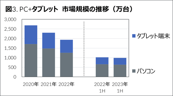 パソコン、タブレット端末市場は前年比3%減の990万台となった(図3)。個人向け市場の縮小が継続する一方で、法人向け市場は文教向けをはじめとする需要が一定数定着したとみられ前年並みを維持した。