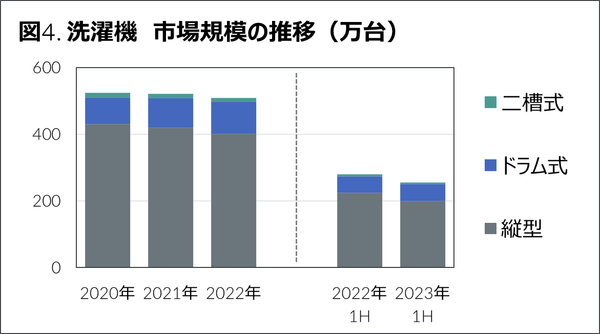 洗濯機は前年から8%減の260万台となった(図4)。タイプ別の数量構成比では、ドラム式が前年から2%ポイント増の20%、縦型が2%ポイント減の78%、二槽式が2%となった。洗濯容量別の数量構成比では、小容量(洗濯容量6kg未満)が23%、中容量(6kg以上8kg未満)が28%、大容量(8kg以上)が49%を占めた。大容量のうち12kg以上の製品は依然として拡大基調にあり、洗濯機に占める数量構成比は前年の12%から14%となった。12kg以上の大容量が堅調に推移したことや原材料費等の高騰により、洗濯機の税抜き平均価格は前年から8%上昇し、89,000円となった。