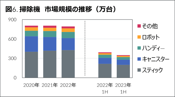 掃除機は前年から11%減の350万台となった(図6)。スティックタイプの数量が前年から7%減、キャニスタータイプは同15%減、ロボットタイプは同11%減となるなど、全ての主要タイプで前年を下回った。掃除機の過半数を占めるスティックタイプの数量構成比は前年からさらに2%ポイント伸長し57%となった。掃除機の税抜き平均価格は前年から6%上昇の25,000円となった。